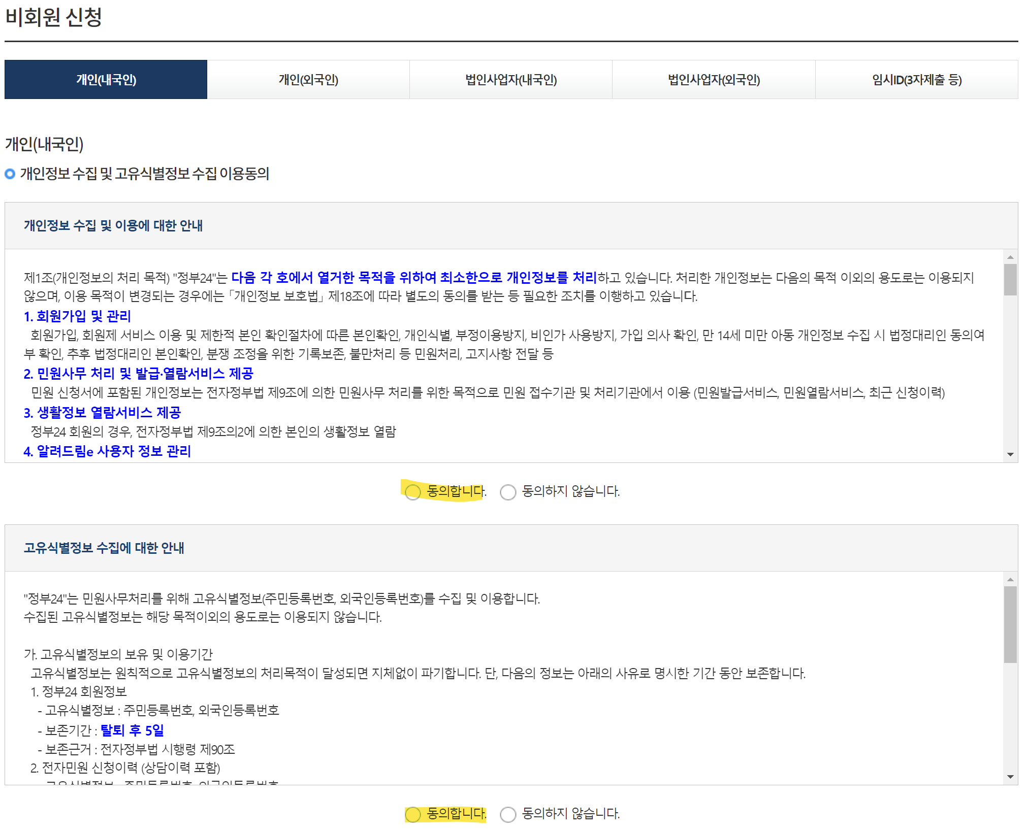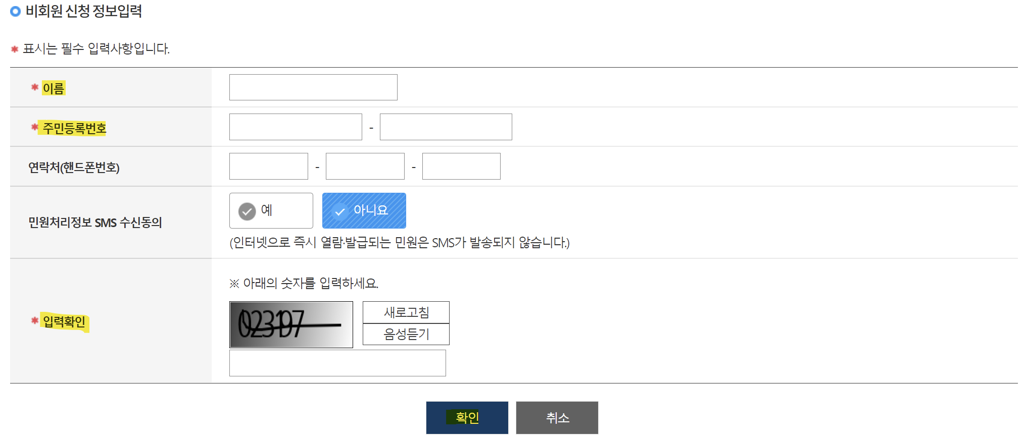3. 동의 관련 내용을 한번 읽어보신 뒤 이름, 주민등록번호, 핸드폰번호 등을 입력합니다. 핸드폰번호는 필수 입력사항이 아니기 때문에 입력하지 않으셔도 됩니다. 입력 후 확인을 눌러주세요.