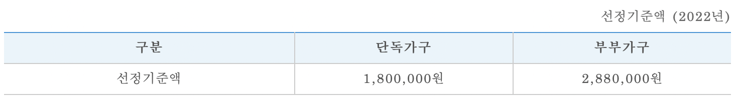 - 소득 : 선정기준액 이하일 것 (매년 변경 됨)