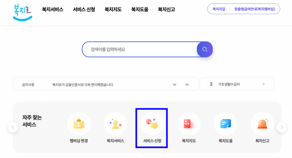 1. 복지로 홈페이지에서 로그인을 한 후 자주 찾는 서비스에서 서비스 신청을 선택합니다.
