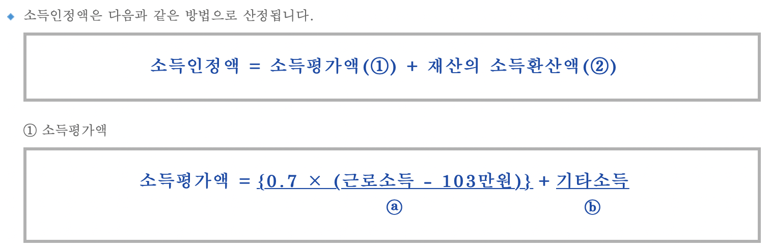 소득인정액은 소득평가액과 재산의 소득환산액을 더한 값이며 소득평가액은 근로소득에서 103만원을 공제한 금액에서 30%를 추가로 공제합니다. 또한 기타소득이 발생하는 경우에 기타소득은 공제 없이 산정됨을 알려드립니다.