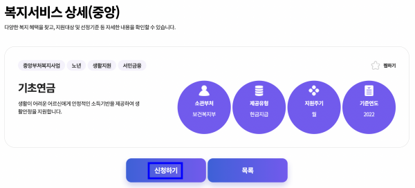 3. 기초연금 자세히보기에서 신청하기를 눌러서 기초연금 수급 신청을 진행하면 됩니다.