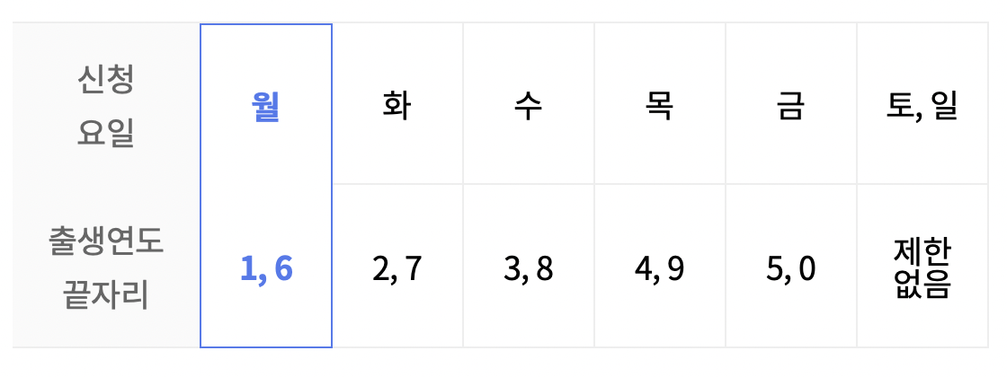 온라인 및 방문신청 첫 주간에는 출생연도 끝자리 숫자 기준 5부제 방식을 적용하여 운영됩니다.