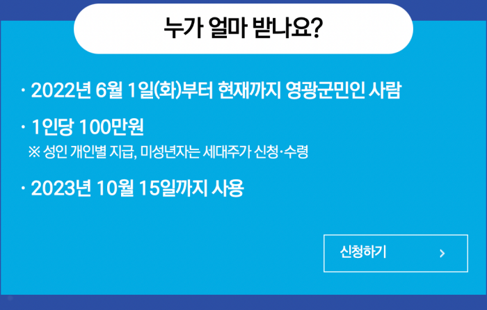 - 지급내용 : 영광사랑카드 또는 영광사랑상품권 100만원