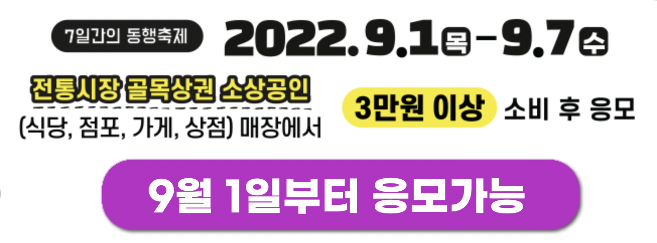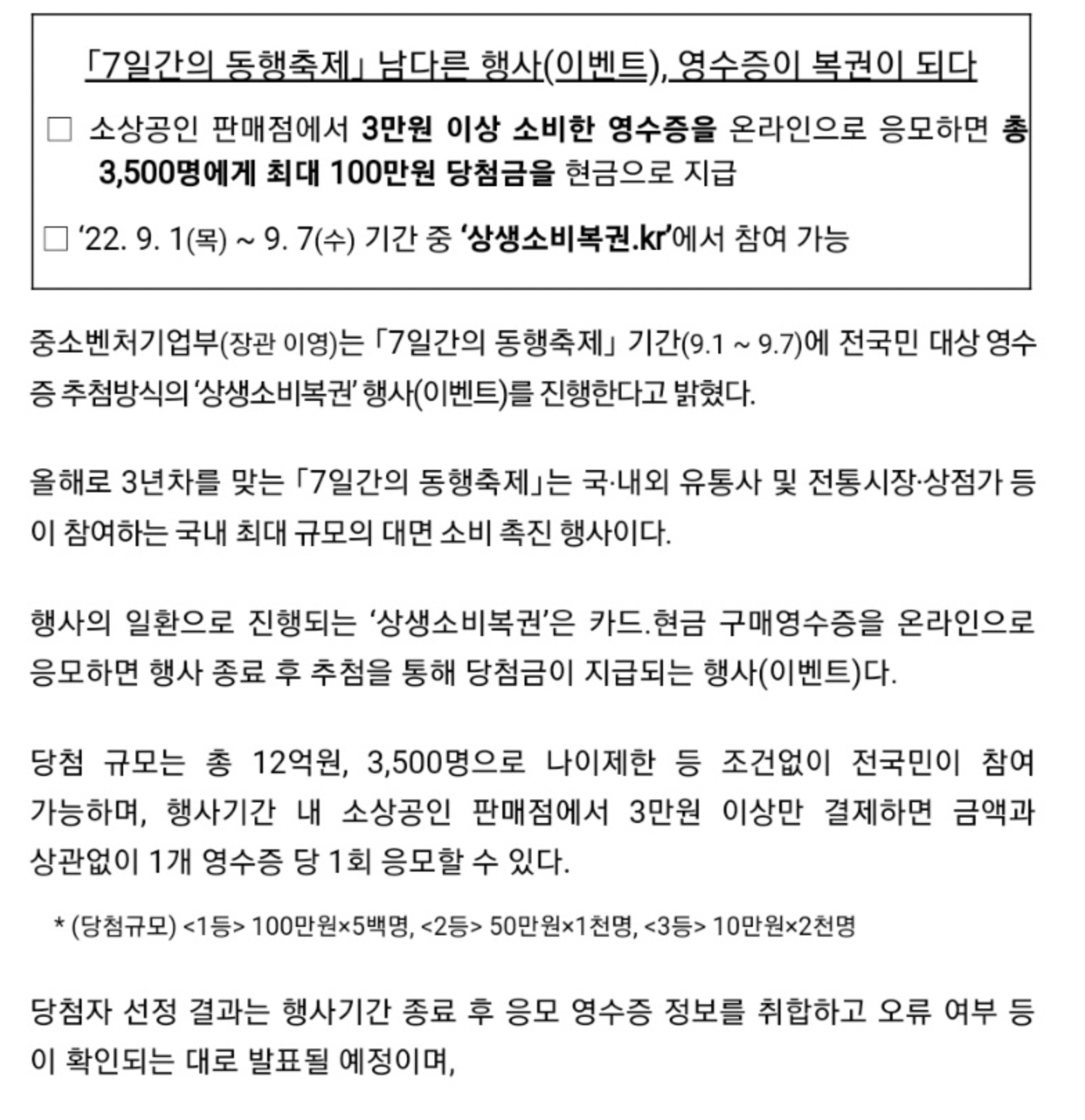 소상공인 시장 진흥공단과 중소벤처 기업부에서는 9월 1일부터 일주일간 동행축제 기간에 맞추어서 전국민을 대상으로 한 영수증 추첨 방식의 상생소비복권 이벤트를 실시합니다. 전통시장, 소상공인 매장 및 골목상권에서 3만원 이상 사용한 영수증이 추첨 할수 있는 티켓이 됩니다.
