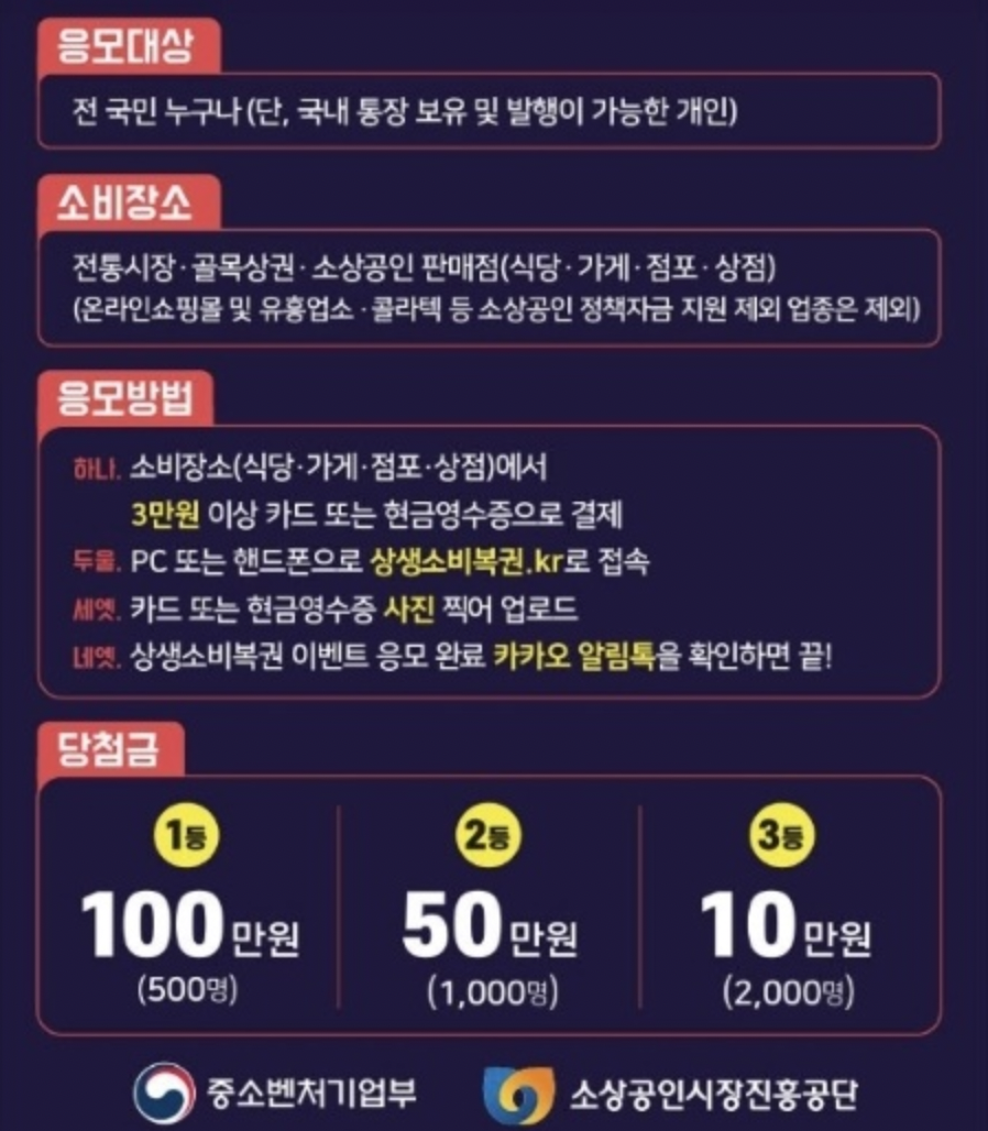 동행축제기간 내에 쇼핑한 카드 혹은 현금 구매 영수증을 온라인으로 응모하면 추첨을 통해서 당첨금을 지급하는 이벤트입니다. 당첨규모는 총 12억원이며 3500명에게 혜택이 돌아가게 됩니다. 1등은 총 500명을 추첨하는데 상금은 100만원입니다. 2등 50만원 1,000명, 3등 10만원 2,000명입니다. 당첨 사실을 통보받은 당첨자는 7일 이내에 상생소비복권.kr 홈페이지에서 당첨금 수령 정보를 입력하면 입금 받을 수 있습니다.