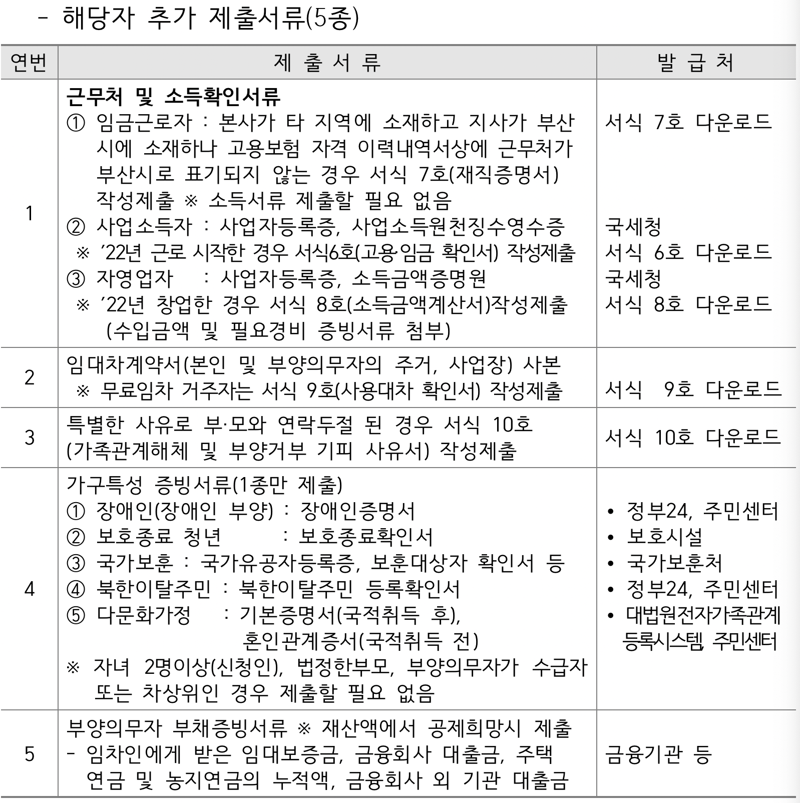모든 제출 서류는 2022년 5월 23일 이후의 발급분만 유효합니다. 온라인 신청화면에서 5종의 서류를 작성해합니다. 그리고 기본 제출서류 4종까지 준비하고 필요에 따라서 해당자 추가 제출서류를 제출하면 됩니다.