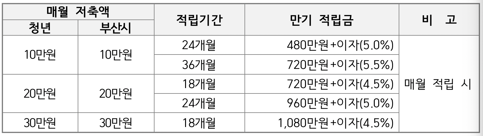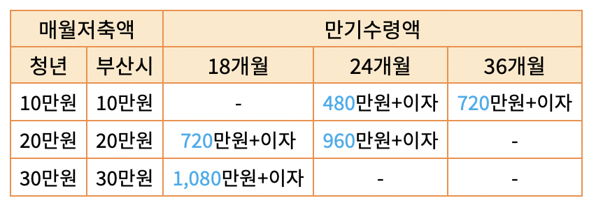 매월 저축하는 금액에 따라서 부산시에서 지원하는 금액도 달라집니다. 또한 이자 또한 적립기간과 저축액에 따라서 달라지는 만큼 자신의 자산형성에 필요한 금액에 따라서 지원하는 것이 좋겠습니다.