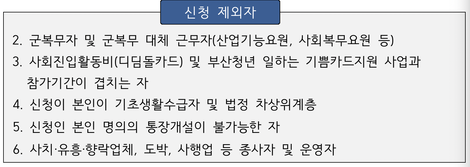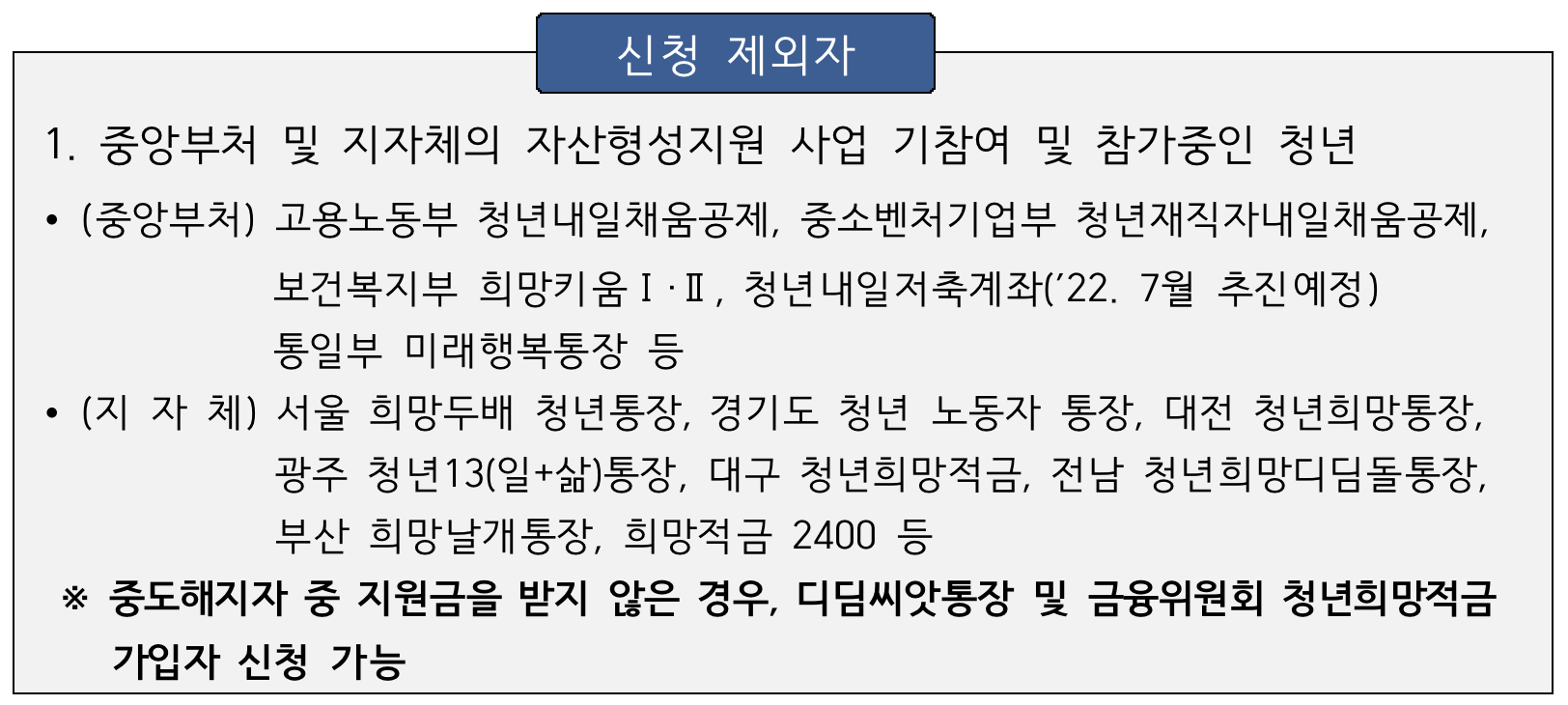 중앙부처 및 지자체의 자산형성지원 사업에 참가중인 청년은 지원할 수 없습니다. 또한 군복무자, 기초생활수급자 등의 청년은 이 사업에 참여할수 없습니다.